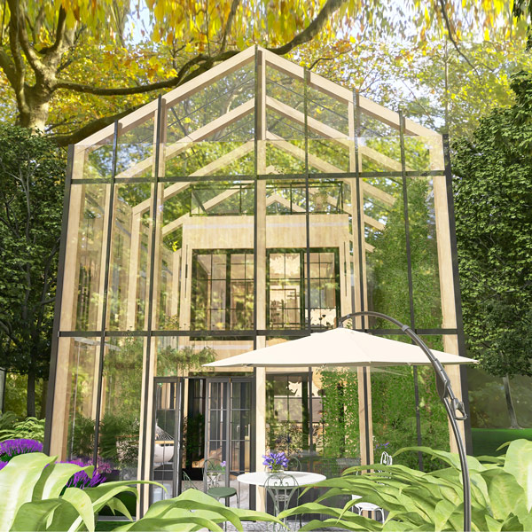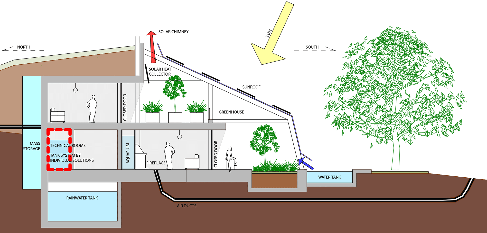 Construction of a house within a greenhouse, as a cohesive design unit maximises solar gain to keep the house warm.